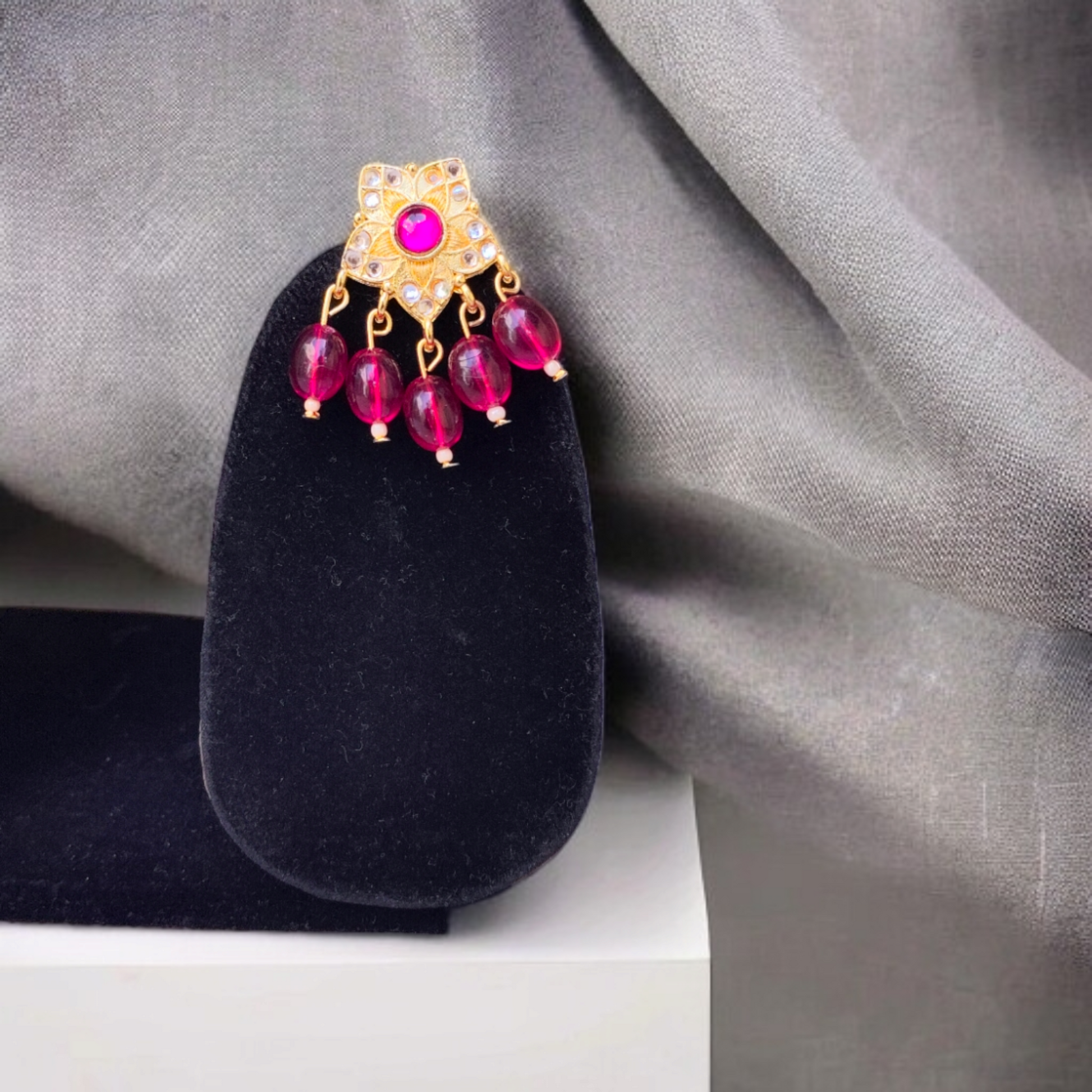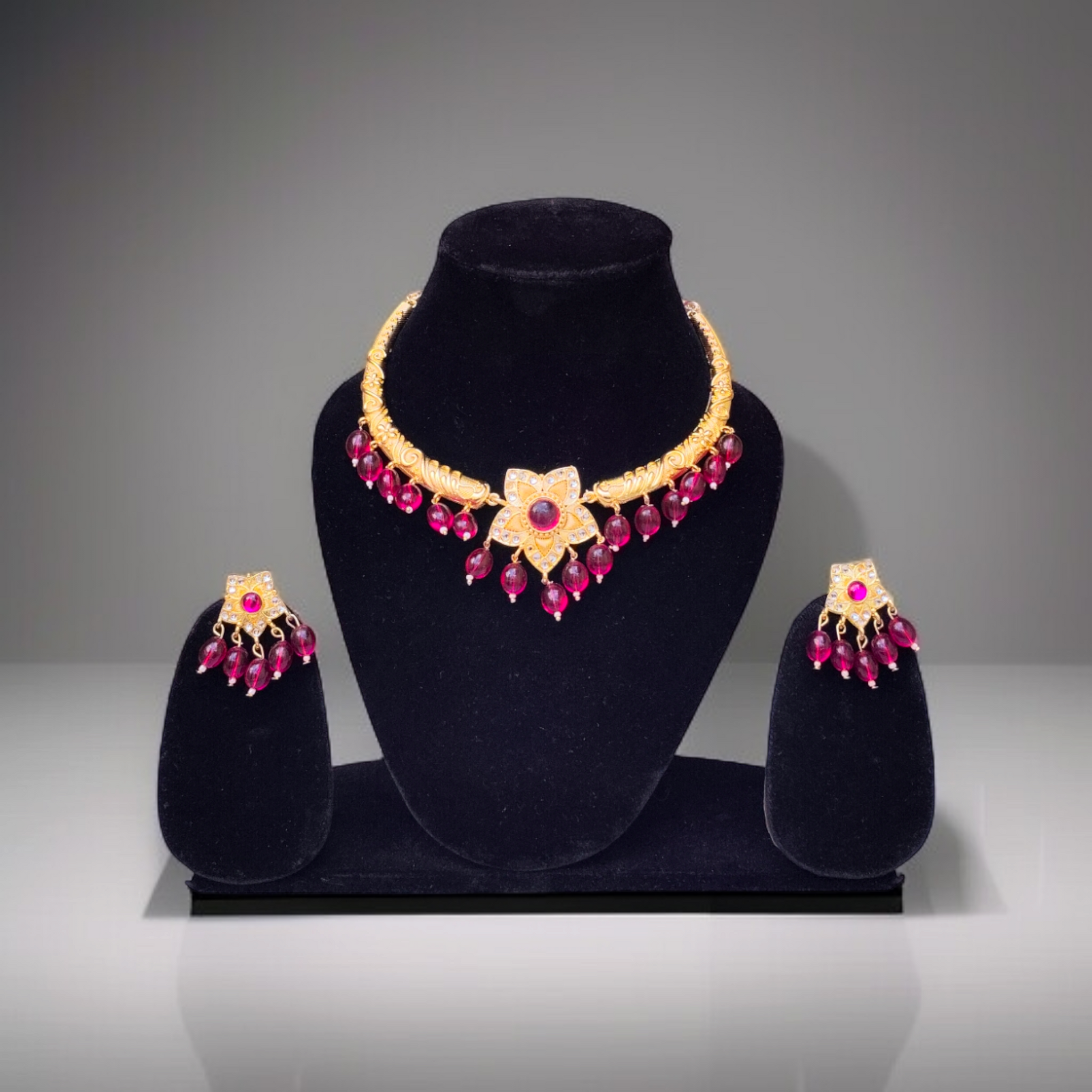 This stunning Rajputi Red Gold Plated Jewelry Set, expertly crafted by talented artisans, will elevate your traditional clothing. This genuine Rajasthani set showcases the Rajputana royal lineage with its vivid red stones set in fine gold plating.